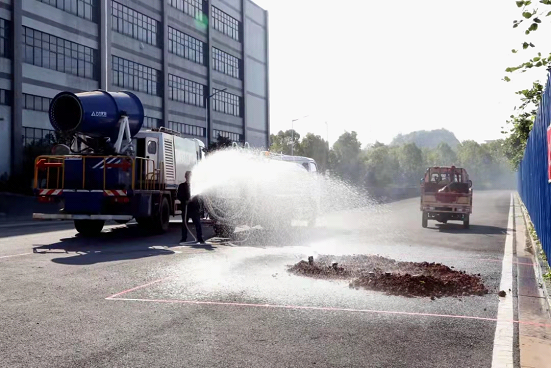 接到突發(fā)環(huán)境事件報告后,市生環(huán)局白沙洲分局負責人立即通知該工地啟動(dòng)黃色預警減排措施,要求施工場(chǎng)地立即停止土石方作業(yè)、建筑拆除、噴涂粉刷、護坡噴漿、混凝土攪拌等施工。同時(shí)通知相關(guān)部門(mén),啟動(dòng)霧炮車(chē)和灑水車(chē),加大作業(yè)頻次,對園區內道路立即采取灑水降塵措施,并向指揮部匯報。園區應急指揮部決定立即啟動(dòng)《白沙洲工業(yè)園區突發(fā)環(huán)境事件應急預案》,并成立現場(chǎng)指揮部、治安組、應急監測組、搶險組、警戒疏散組、信息傳輸組等各專(zhuān)業(yè)組,各小組在指揮部的組織下相繼采取封鎖現場(chǎng),緊急疏散公司員工,設置警戒線(xiàn),組織灑水車(chē)、霧炮車(chē)、裝載車(chē)及環(huán)衛工人進(jìn)場(chǎng)作業(yè),取樣點(diǎn)應急監測等措施。在各參演方的密切配合和共同努力下,經(jīng)過(guò)50分鐘緊張、有序的處置,事故現場(chǎng)得到控制,最終監測結果達標后總指揮宣布應急狀態(tài)解除。