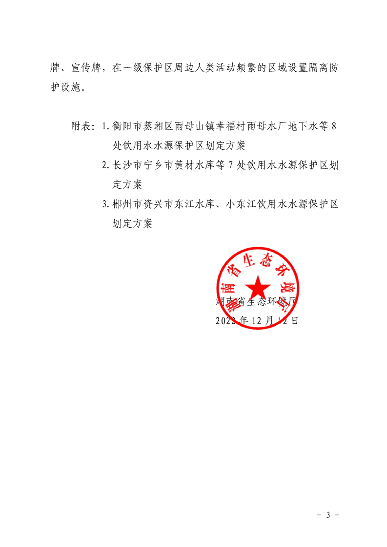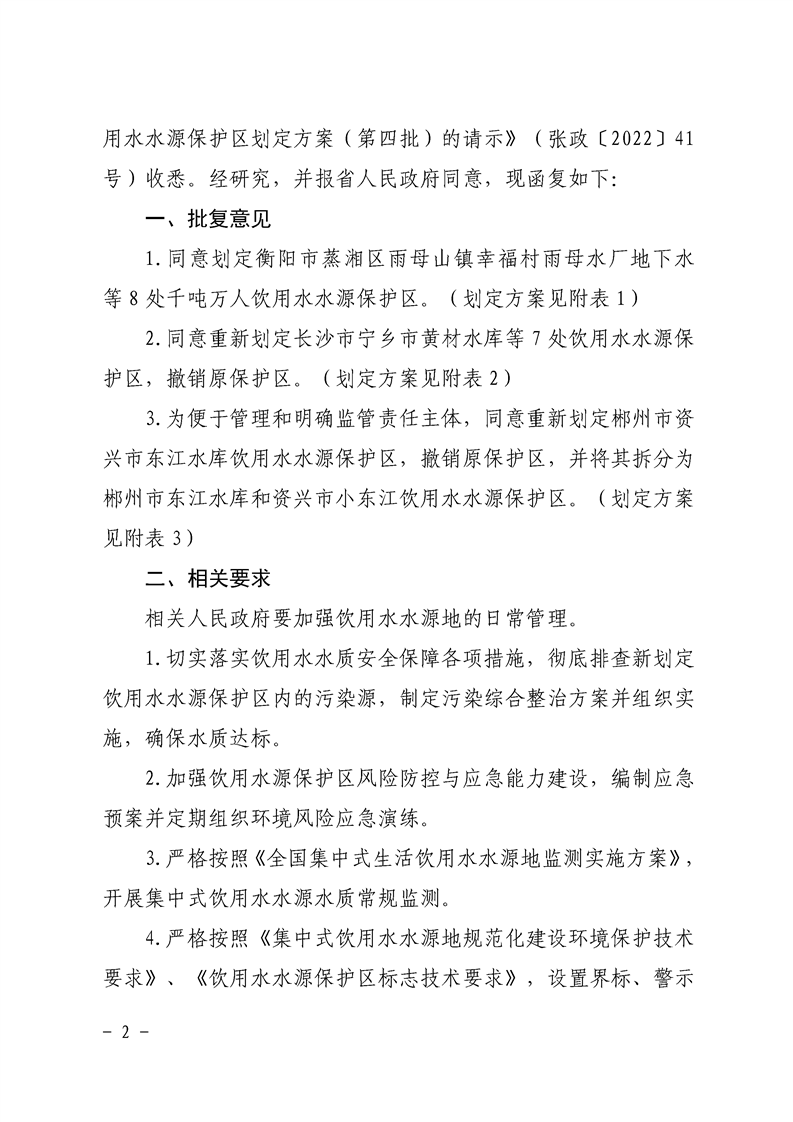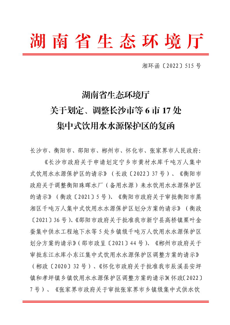 關(guān)于劃定、調整長(cháng)沙市等6市17處集中式飲用水水源保護區的復函(湘環(huán)函〔2022〕515號)