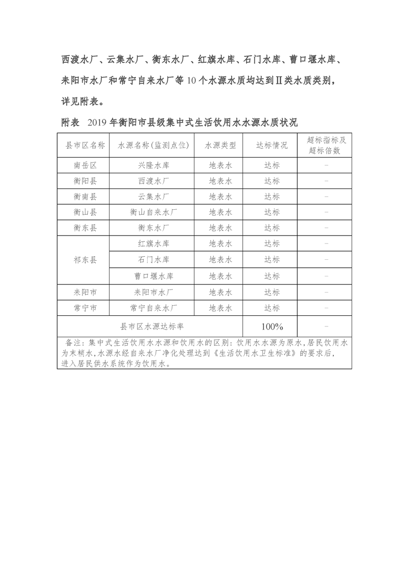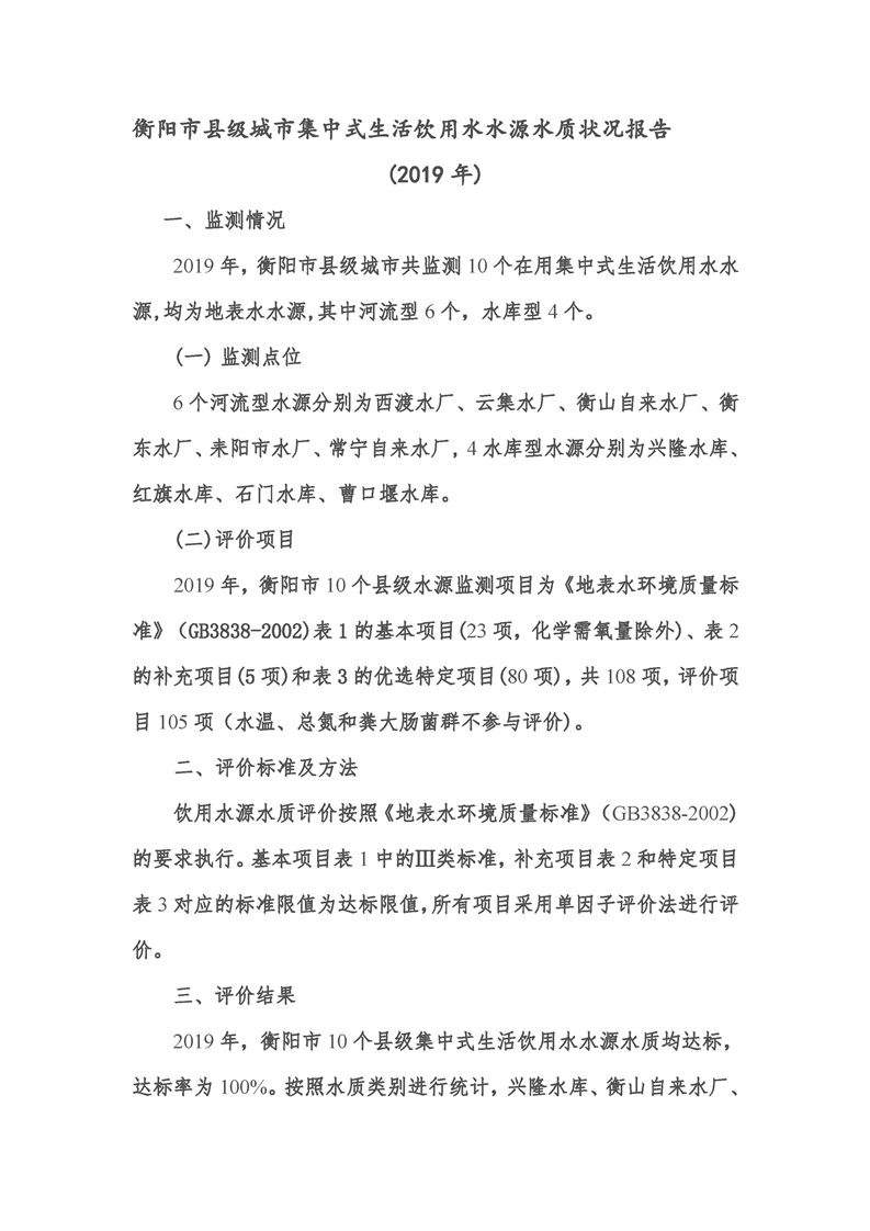 衡陽(yáng)市縣級城市集中式生活飲用水水源水質(zhì)狀況報告(2019年)