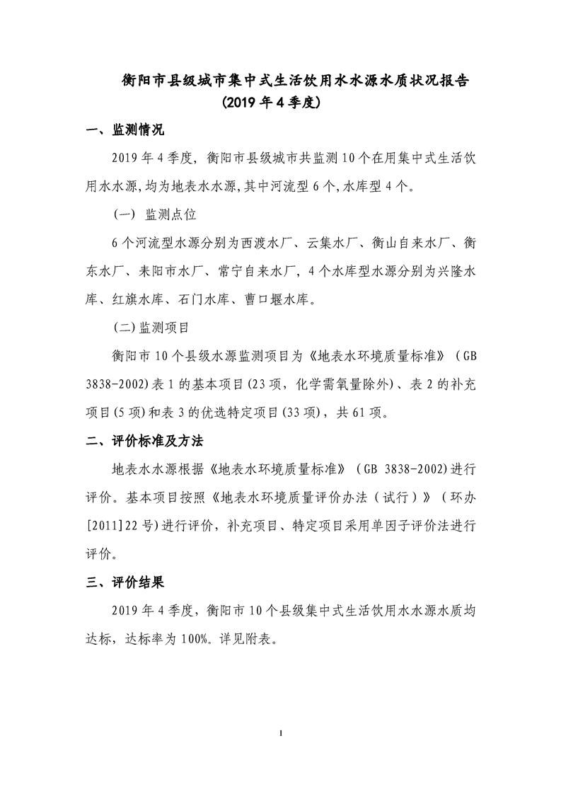 衡陽(yáng)市縣級城市集中式生活飲用水水源水質(zhì)狀況報告(2019年4季度)