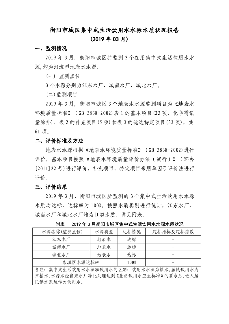衡陽(yáng)市城區集中式生活飲用水水源水質(zhì)狀況報告(2019年03月)